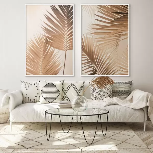 Plakat Liście palmowe w brązowych odcieniach, neutralne tło, minimalistyczny styl, naturalne oświetlenie, tropikalny klimat d00880