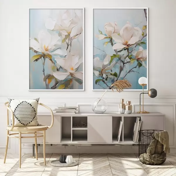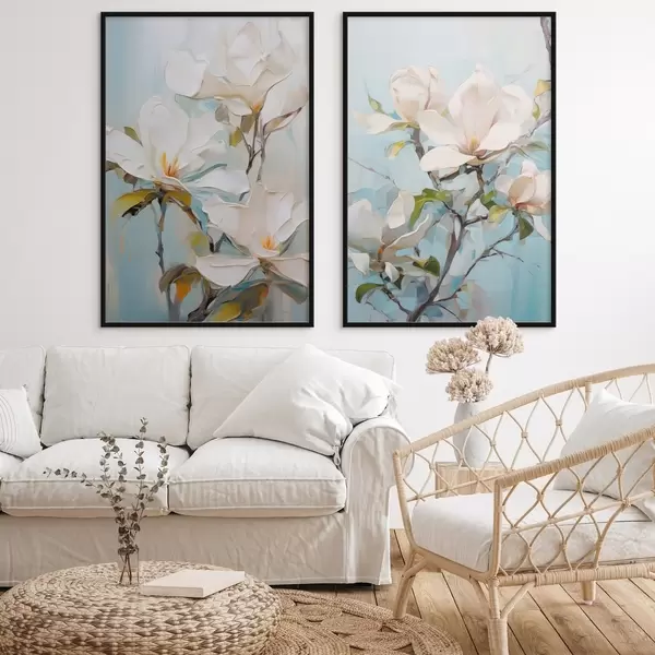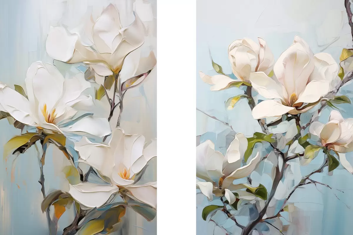 Plakat Białe kwiaty magnolii, jasnoniebieskie tło z delikatnymi pociągnięciami pędzla, styl malarstwa olejnego, faktura impasto d00881