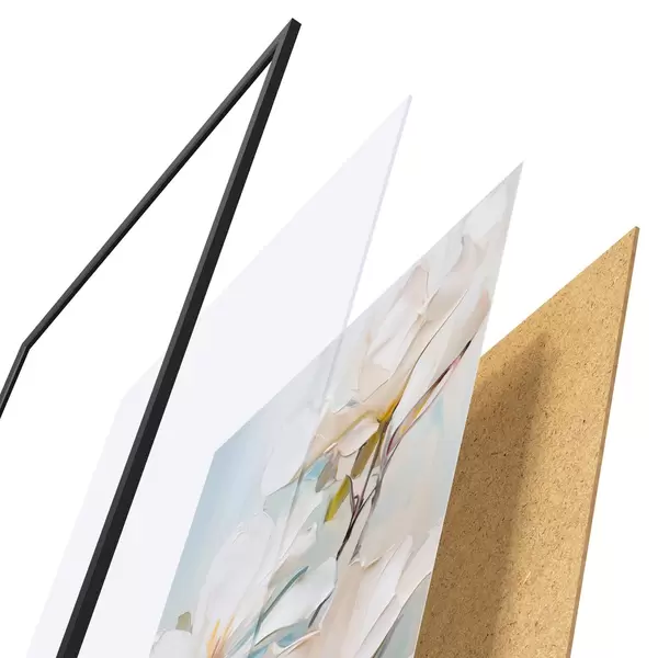 Plakat składa się z ramy, pleksi, wydrukowanego obrazu i podkładu z płyty wiórowej. Plakat można natychmiast zawiesić na ścianie dzięki uchwytom z tyłu.