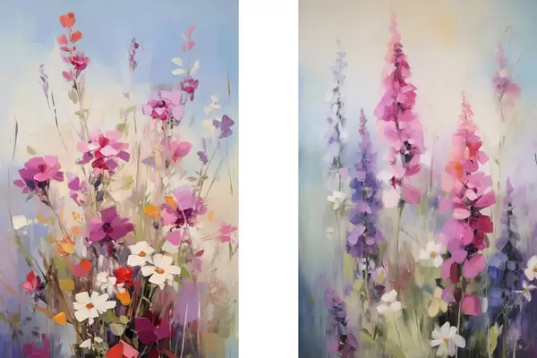 Poster Żywe kwiaty z białymi stokrotkami na polu, delikatne pociągnięcia pędzla, pastelowe kolory, styl impresjonistyczny Nr d00882