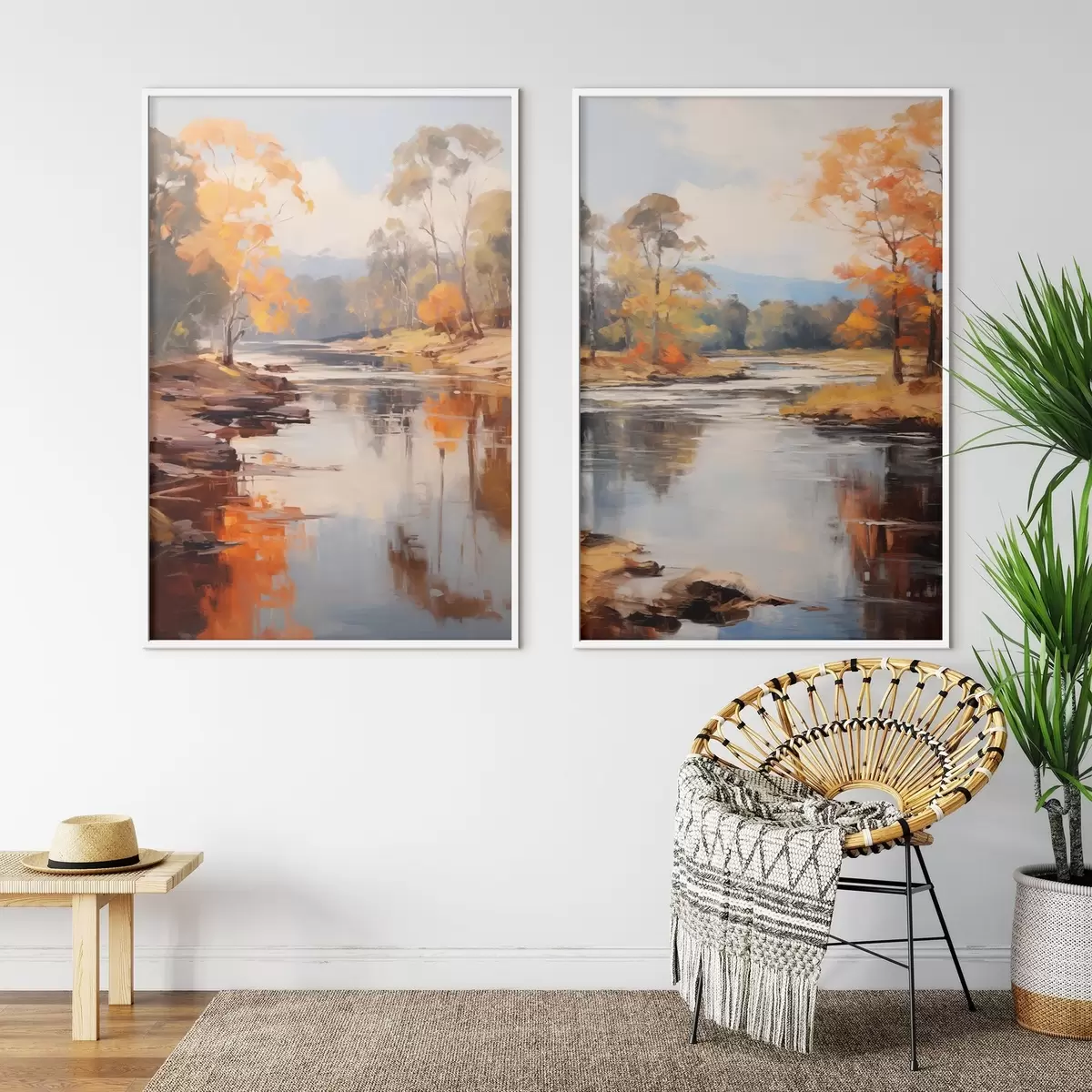 Plakat Jesienny krajobraz, rzeka z drzewami na brzegu, las w tle, odbicia na wodzie d00883