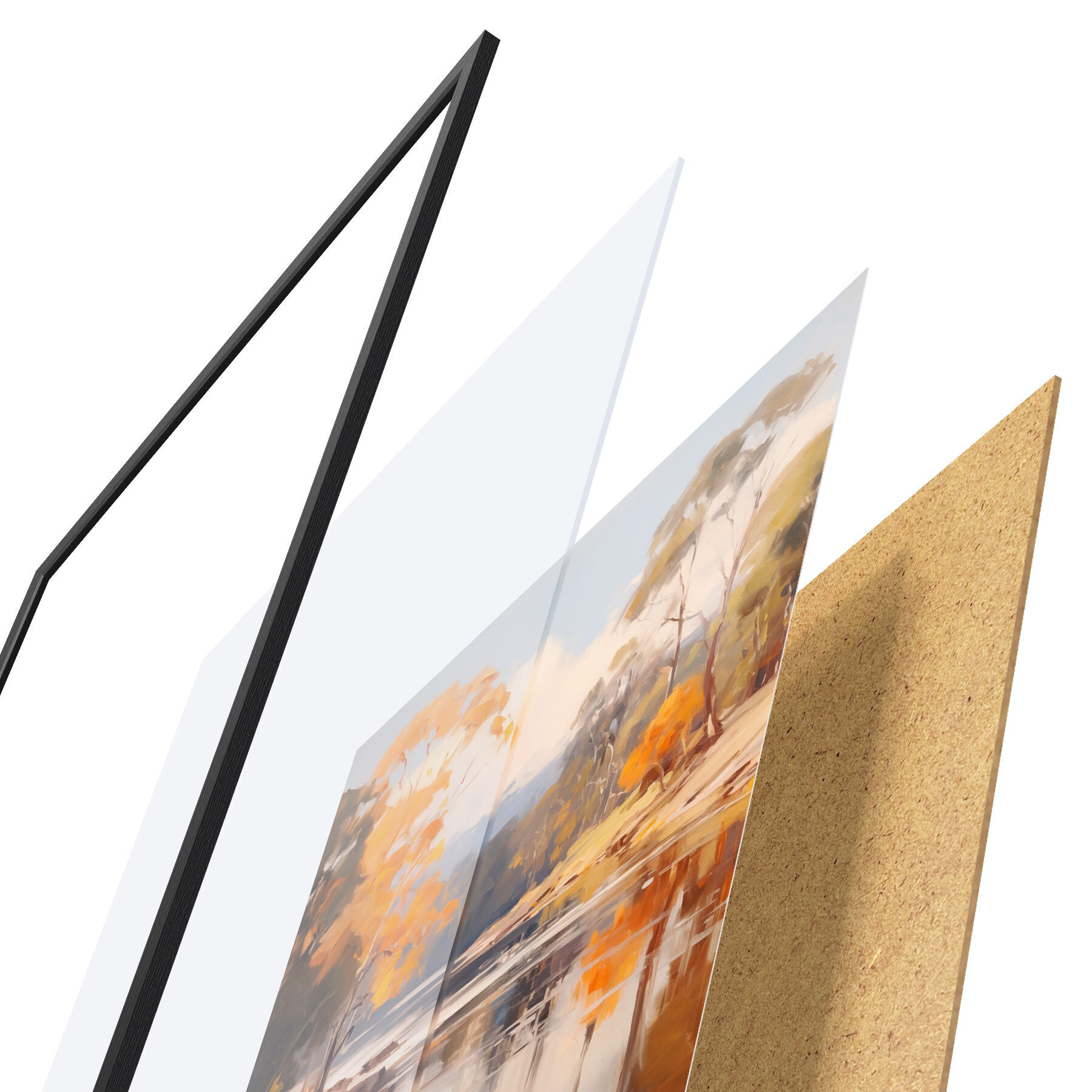 Plakat składa się z ramy, pleksi, wydrukowanego obrazu i podkładu z płyty wiórowej. Plakat można natychmiast zawiesić na ścianie dzięki uchwytom z tyłu.