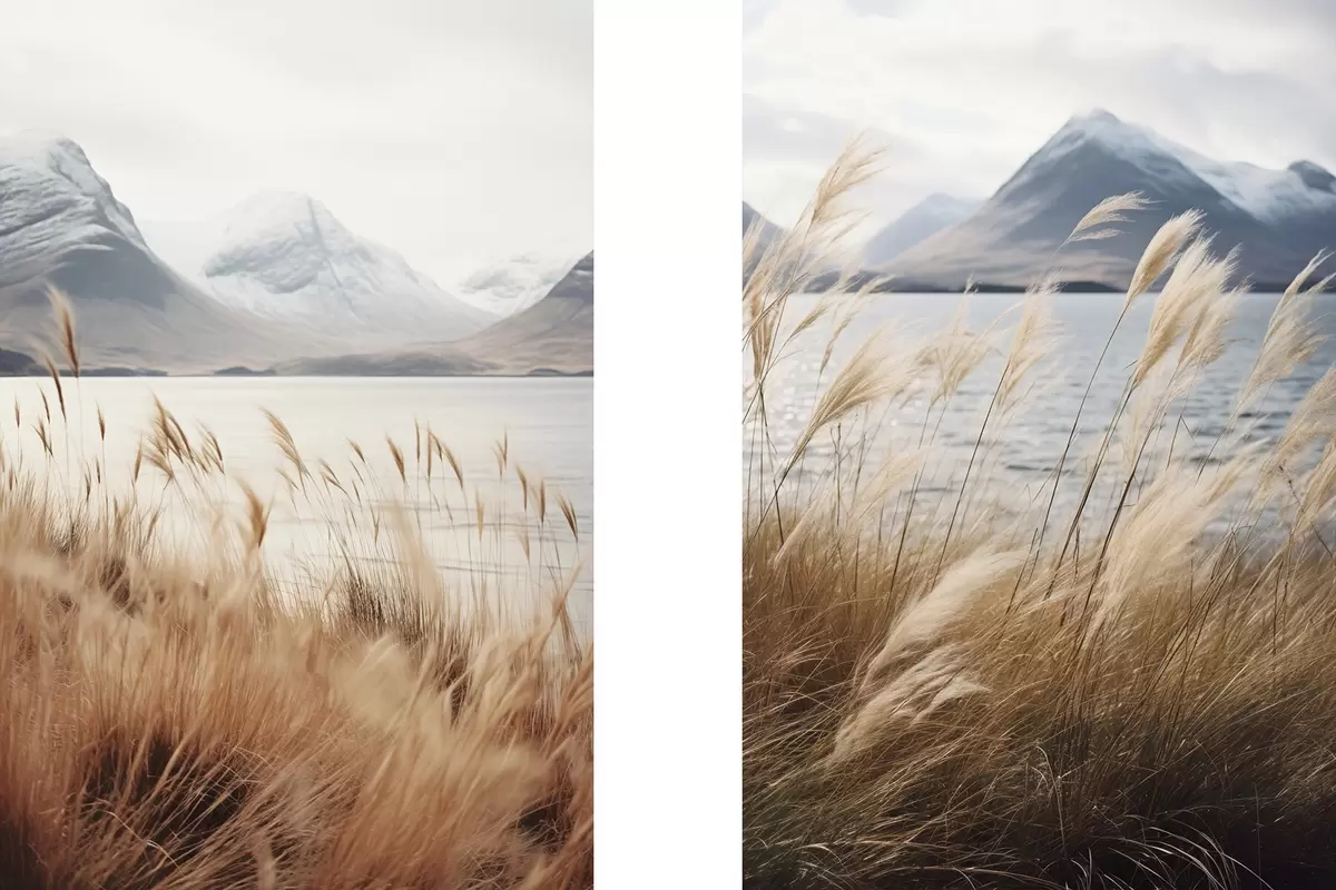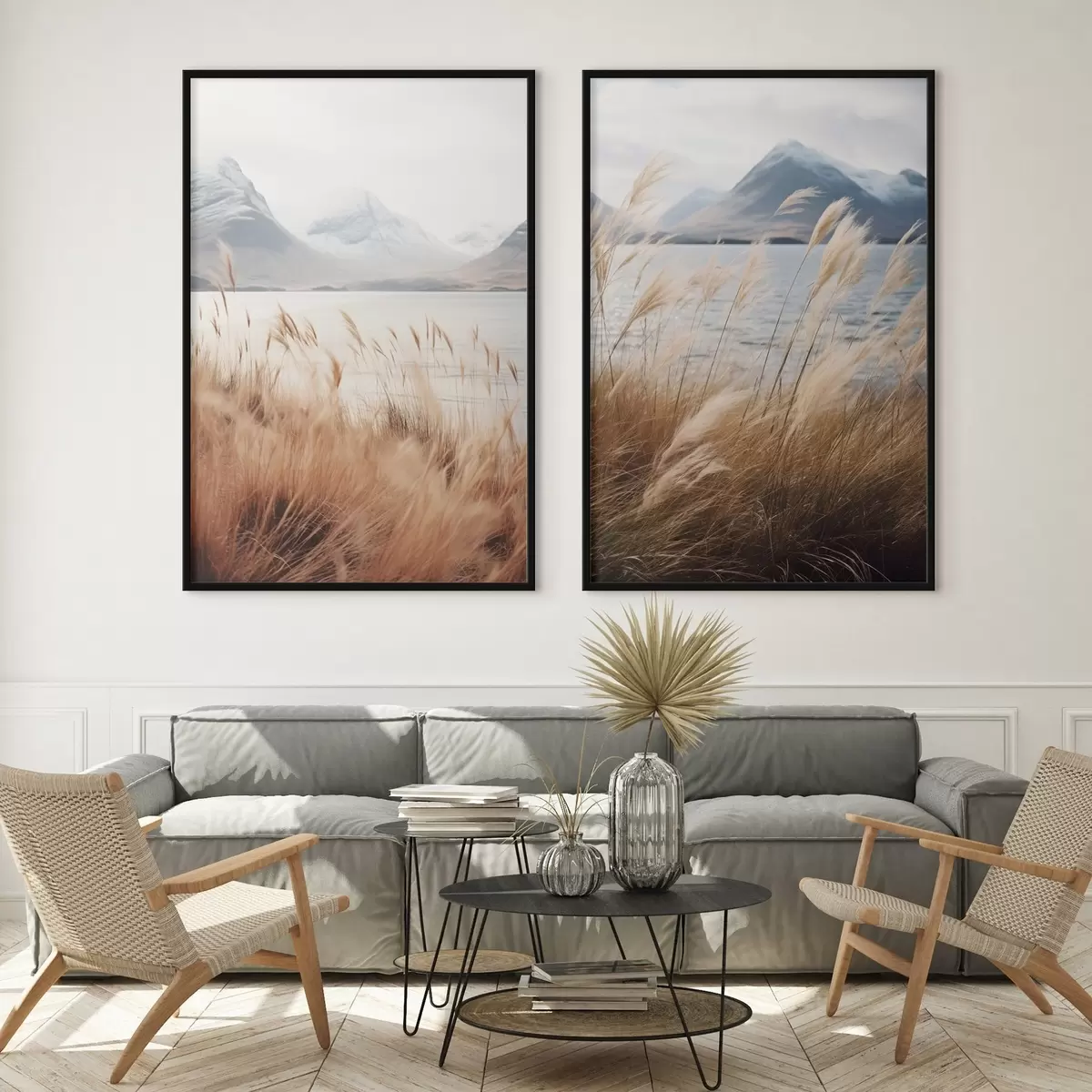 Plakat Trawa pampasowa z jeziorem i górami w tle, delikatne oświetlenie, stonowane kolory, styl naturalistyczny d00884