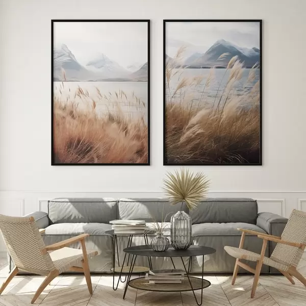 Poster Trawa pampasowa z jeziorem i górami w tle, delikatne oświetlenie, stonowane kolory, styl naturalistyczny Nr d00884