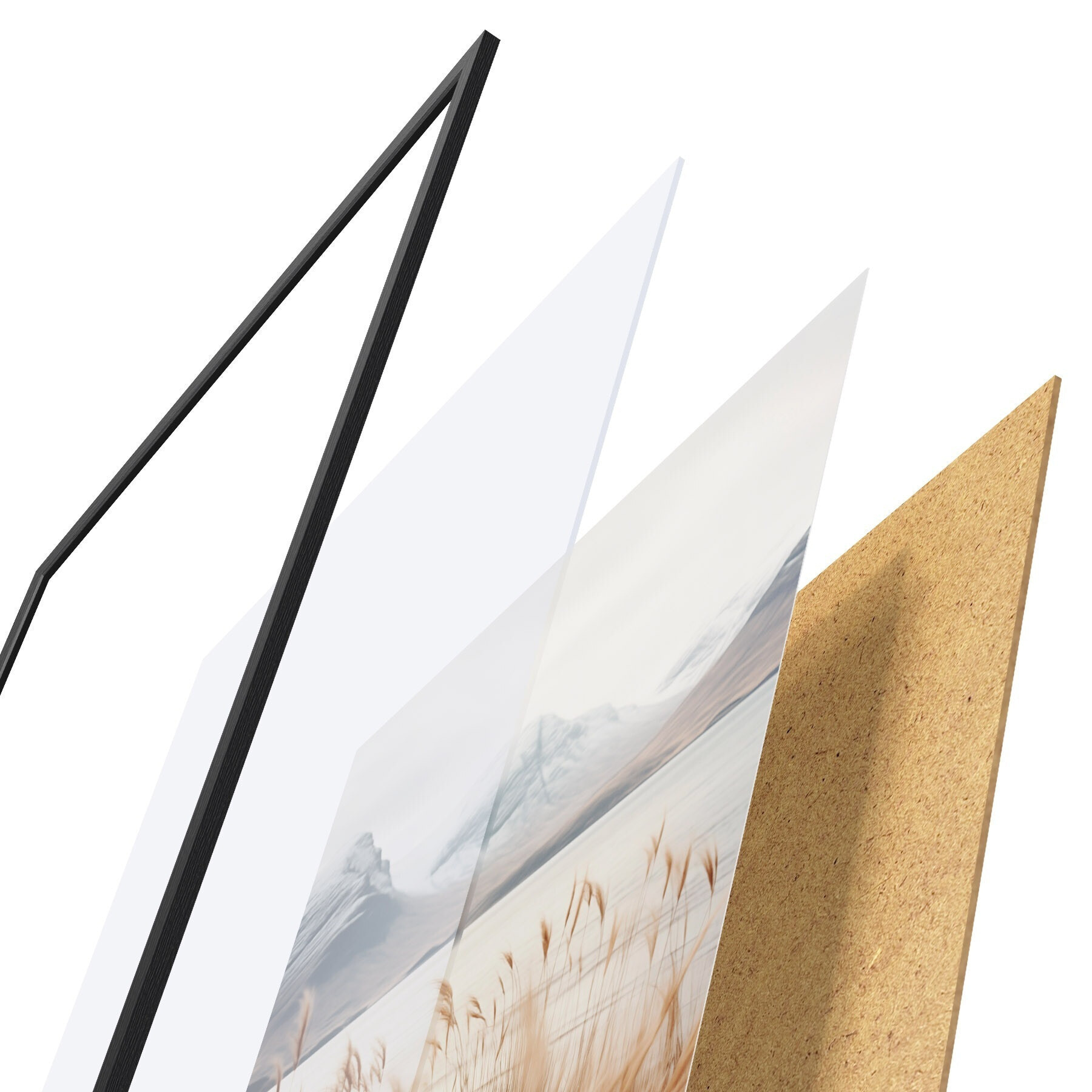 Plakat składa się z ramy, pleksi, wydrukowanego obrazu i podkładu z płyty wiórowej. Plakat można natychmiast zawiesić na ścianie dzięki uchwytom z tyłu.