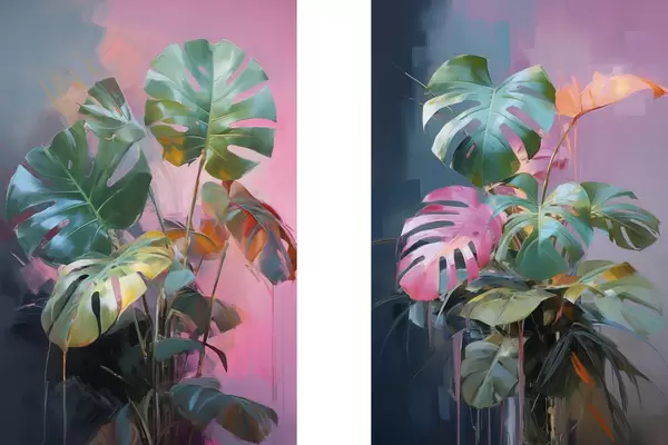 Poster Abstrakcyjna roślina monstera o intensywnie zielonych liściach na tle delikatnych odcieni różu i fioletu Nr d00886