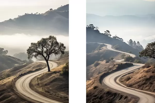 Plakat Kręta droga przez pagórkowaty krajobraz z suchą trawą pod czystym niebem, z górami w oddali d00887