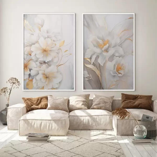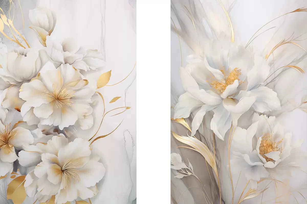 Poster Białe kwiaty z żółtymi detalami, płatki z delikatnymi cieniami, jasne tło z subtelnym efektem marmuru Nr d00889