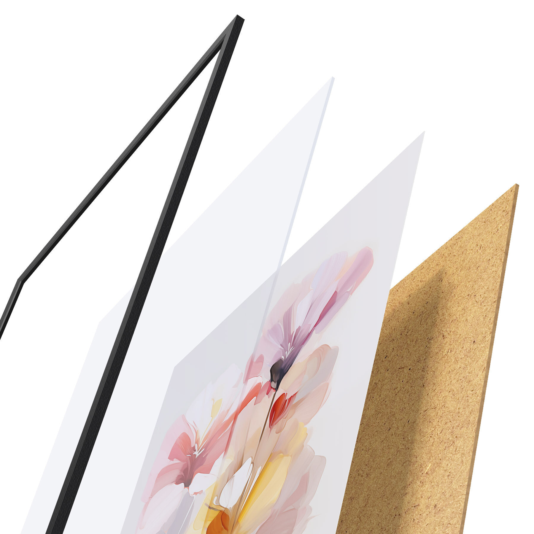 Plakat składa się z ramy, pleksi, wydrukowanego obrazu i podkładu z płyty wiórowej. Plakat można natychmiast zawiesić na ścianie dzięki uchwytom z tyłu.