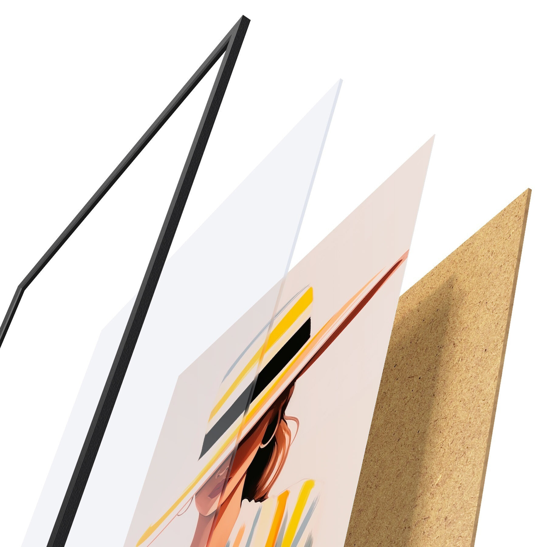 Plakat składa się z ramy, pleksi, wydrukowanego obrazu i podkładu z płyty wiórowej. Plakat można natychmiast zawiesić na ścianie dzięki uchwytom z tyłu.
