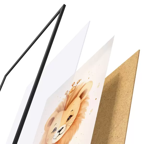 Plakat składa się z ramy, pleksi, wydrukowanego obrazu i podkładu z płyty wiórowej. Plakat można natychmiast zawiesić na ścianie dzięki uchwytom z tyłu.