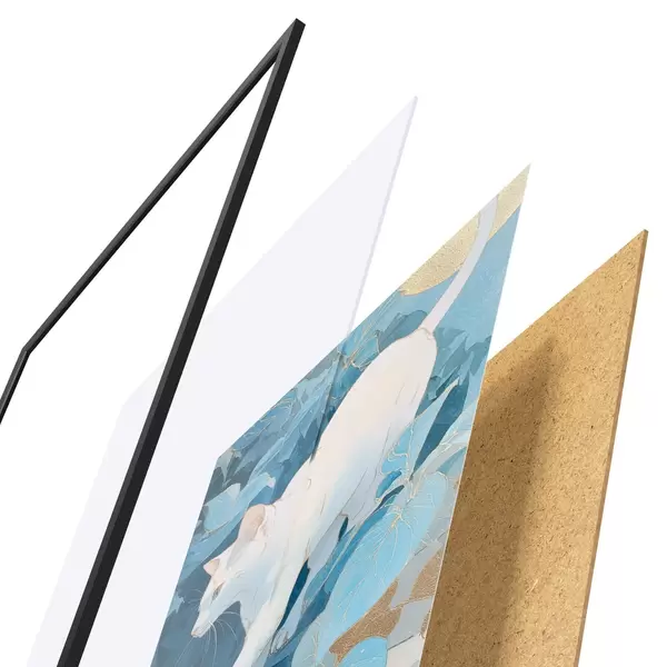 Plakat składa się z ramy, pleksi, wydrukowanego obrazu i podkładu z płyty wiórowej. Plakat można natychmiast zawiesić na ścianie dzięki uchwytom z tyłu.
