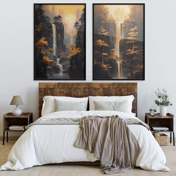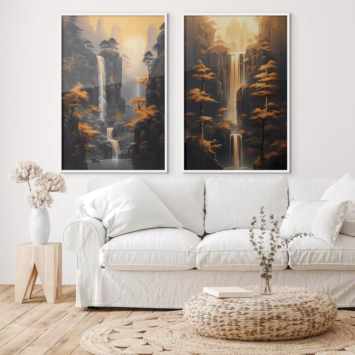 Poster Krajobraz z wodospadem i górami w złocistym świetle Nr d00928