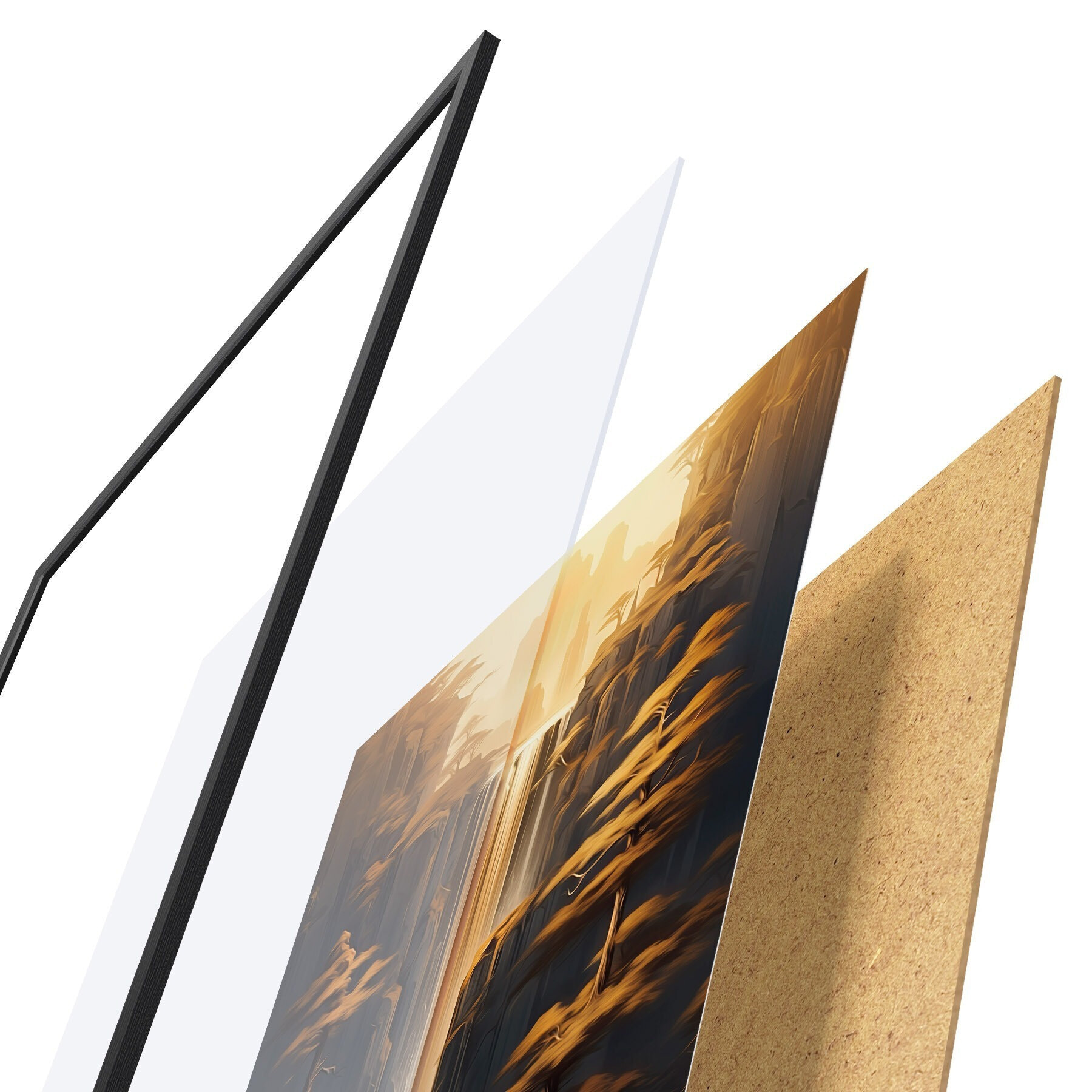 Plakat składa się z ramy, pleksi, wydrukowanego obrazu i podkładu z płyty wiórowej. Plakat można natychmiast zawiesić na ścianie dzięki uchwytom z tyłu.