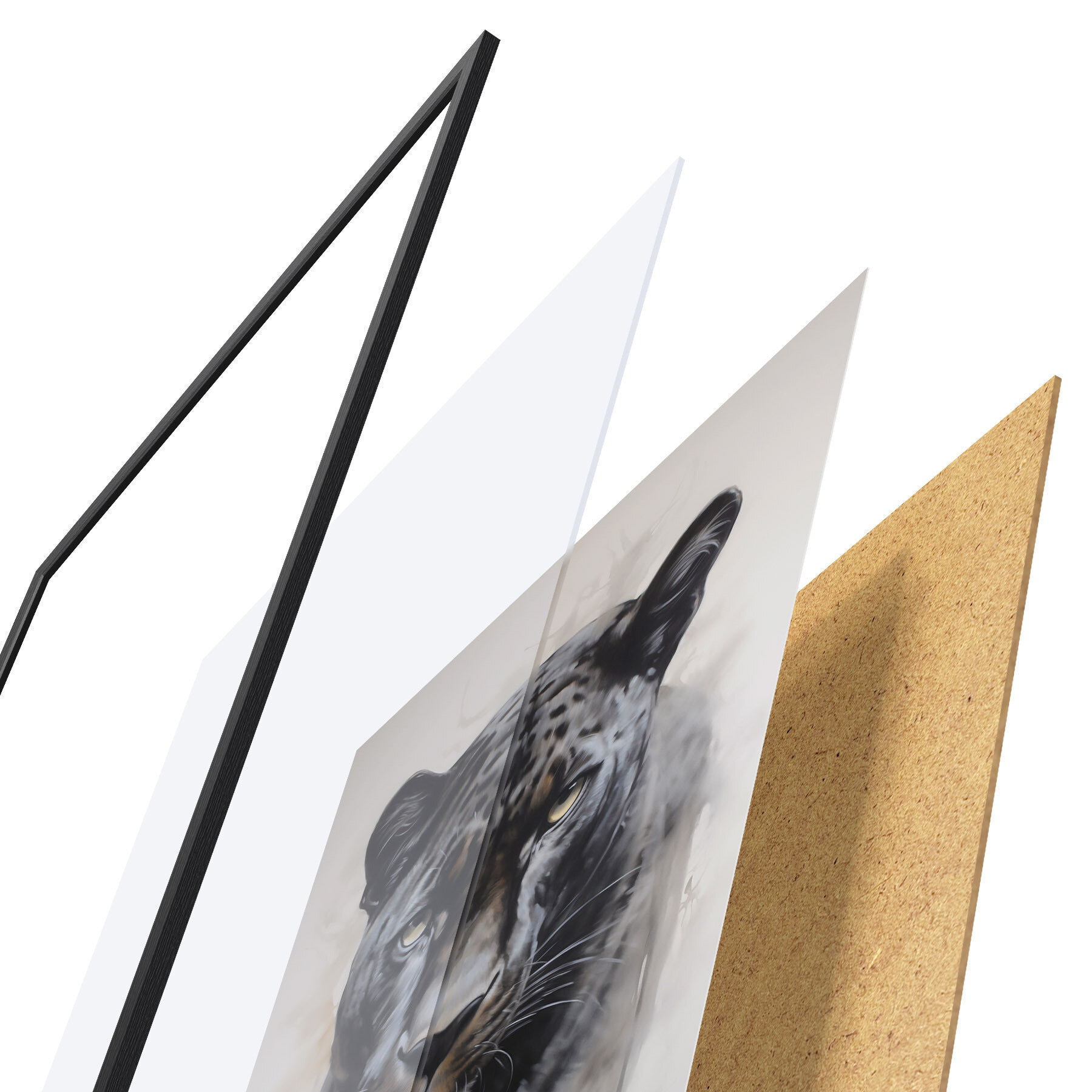 Plakat składa się z ramy, pleksi, wydrukowanego obrazu i podkładu z płyty wiórowej. Plakat można natychmiast zawiesić na ścianie dzięki uchwytom z tyłu.