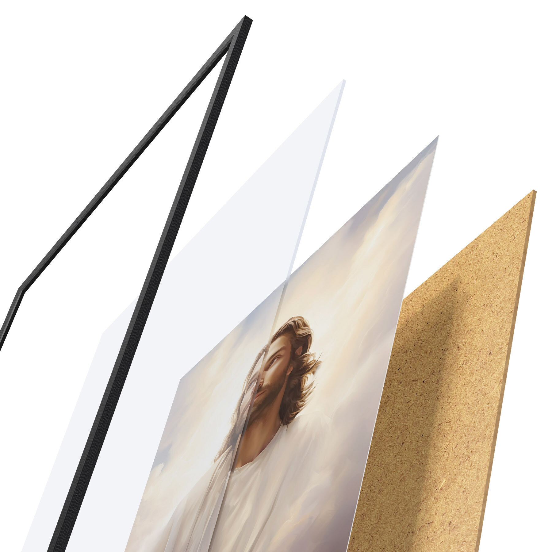 Plakat składa się z ramy, pleksi, wydrukowanego obrazu i podkładu z płyty wiórowej. Plakat można natychmiast zawiesić na ścianie dzięki uchwytom z tyłu.