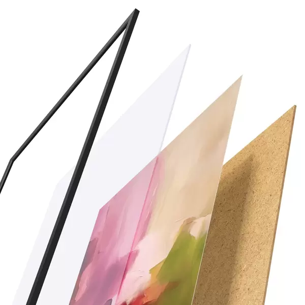 Plakat składa się z ramy, pleksi, wydrukowanego obrazu i podkładu z płyty wiórowej. Plakat można natychmiast zawiesić na ścianie dzięki uchwytom z tyłu.