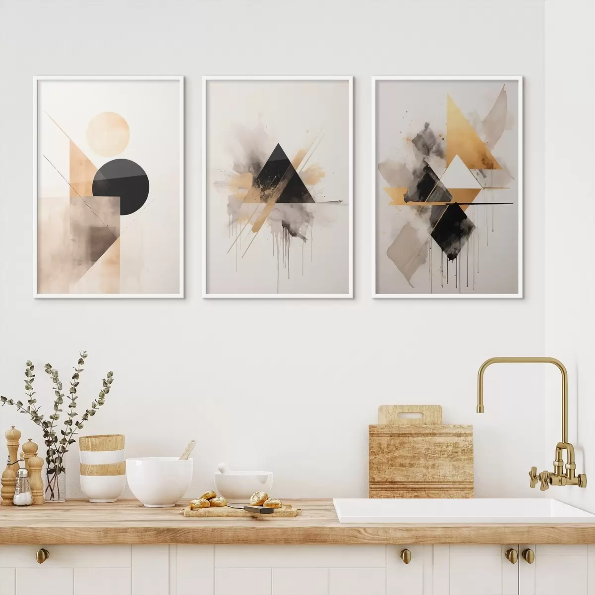 Plakat Geometryczne trójkąty z plamami atramentu, czarne i ochrowe d00963