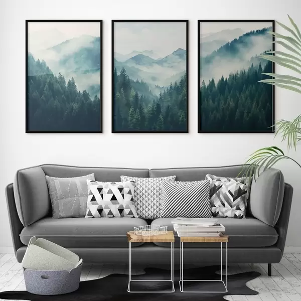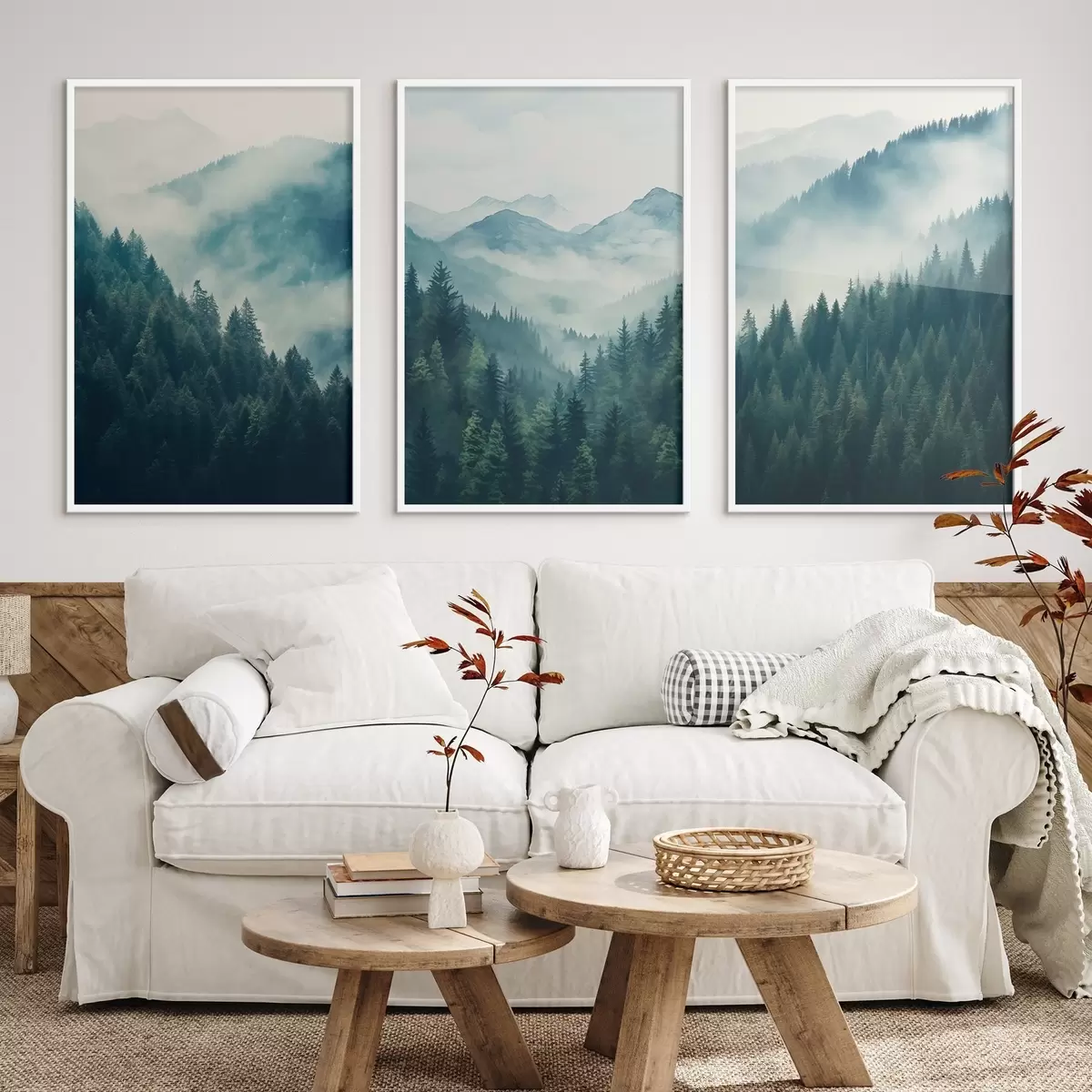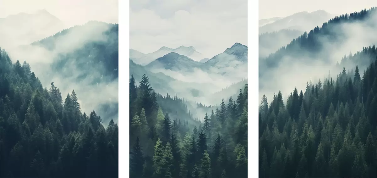 Poster Mgliste, pokryte sosnami góry, pokryte delikatnymi odcieniami zieleni i błękitu. Nr d00964