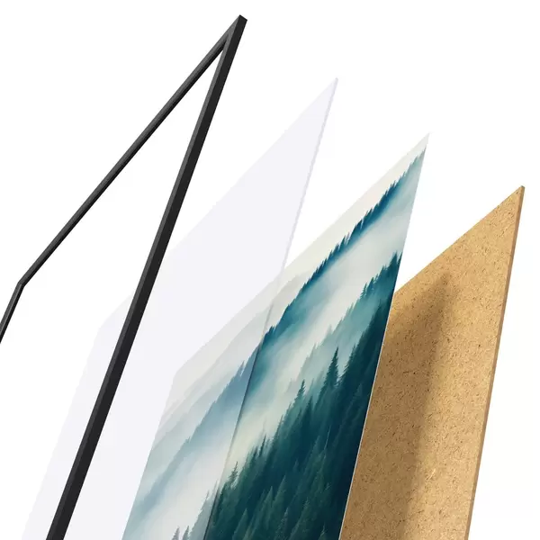 Plakat składa się z ramy, pleksi, wydrukowanego obrazu i podkładu z płyty wiórowej. Plakat można natychmiast zawiesić na ścianie dzięki uchwytom z tyłu.
