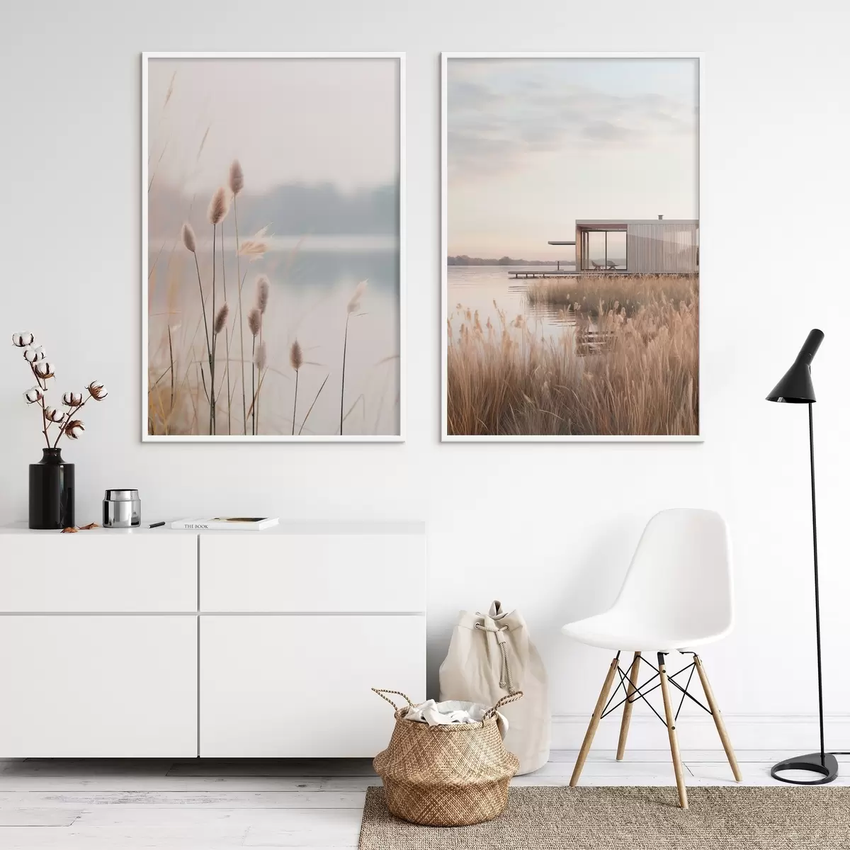 Poster Miękkie trzciny nad spokojnym jeziorem i nowoczesna chatka na brzegu Nr d00970