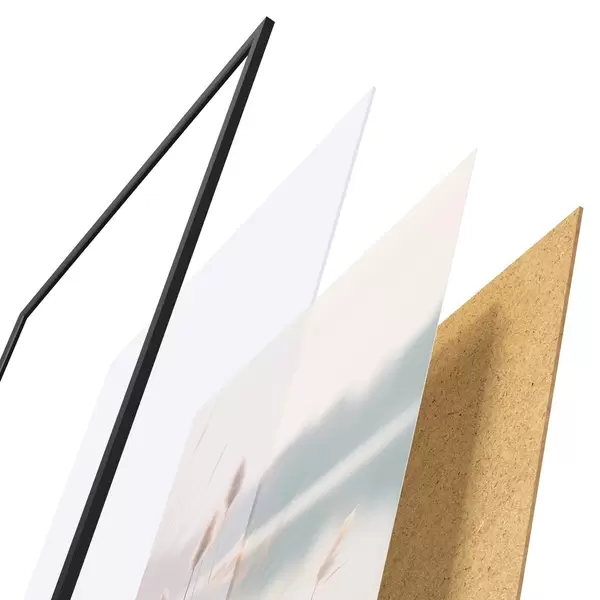 Plakat składa się z ramy, pleksi, wydrukowanego obrazu i podkładu z płyty wiórowej. Plakat można natychmiast zawiesić na ścianie dzięki uchwytom z tyłu.