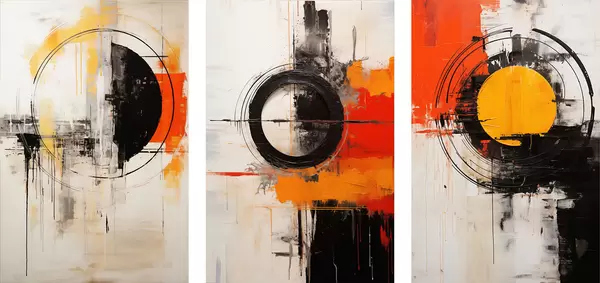 Plakat Teksturowane koła i odważne pociągnięcia pędzlem w kolorach czarnym, ochry i pomarańczowym. d00974