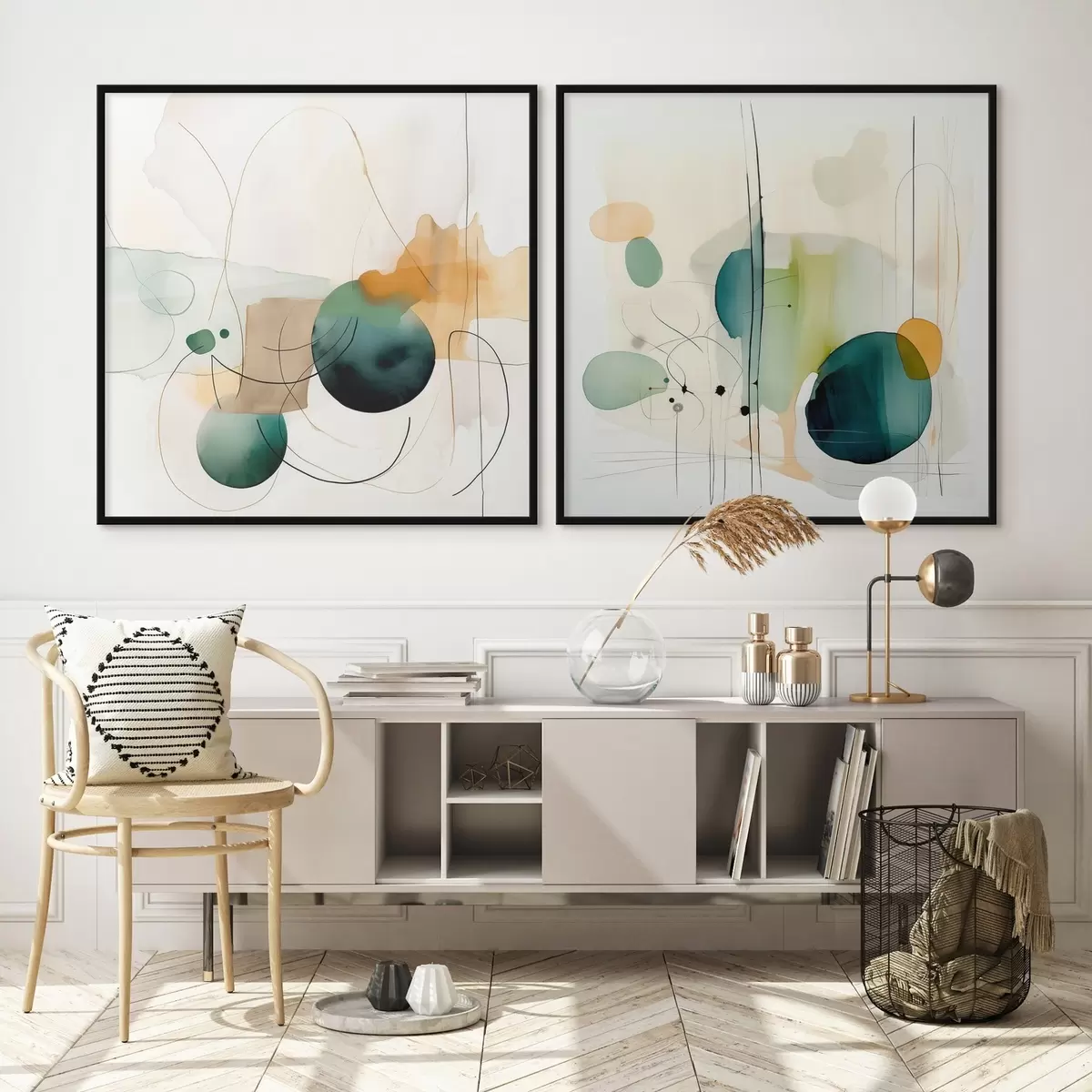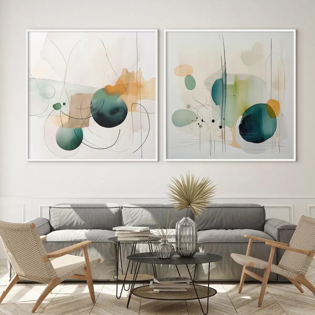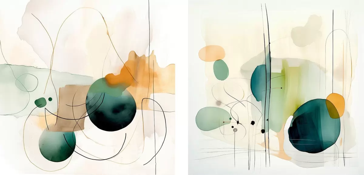 Plakat Dwuczęściowa abstrakcyjna kompozycja z delikatnymi plamami koloru d00985