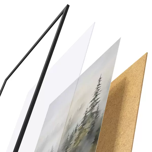 Plakat składa się z ramy, pleksi, wydrukowanego obrazu i podkładu z płyty wiórowej. Plakat można natychmiast zawiesić na ścianie dzięki uchwytom z tyłu.