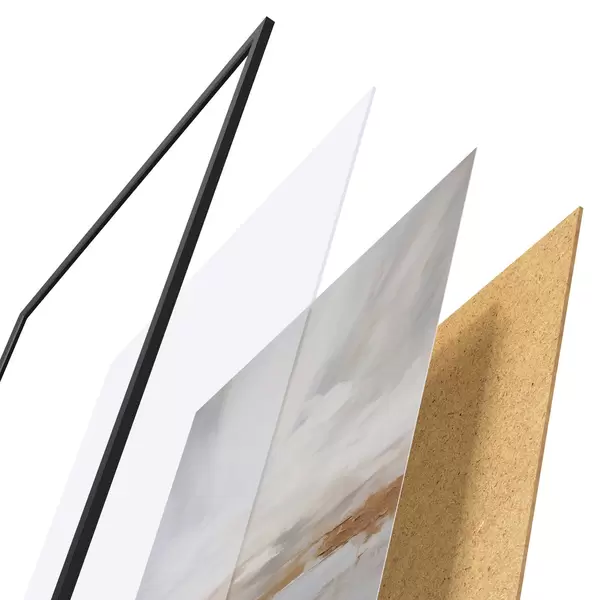 Plakat składa się z ramy, pleksi, wydrukowanego obrazu i podkładu z płyty wiórowej. Plakat można natychmiast zawiesić na ścianie dzięki uchwytom z tyłu.