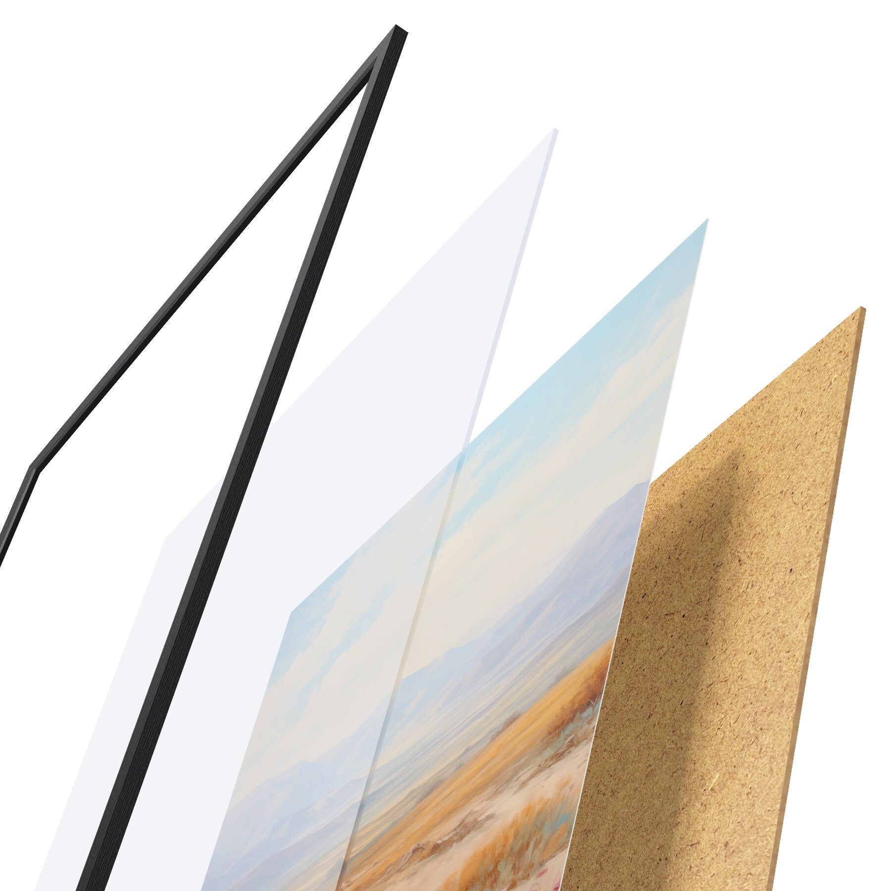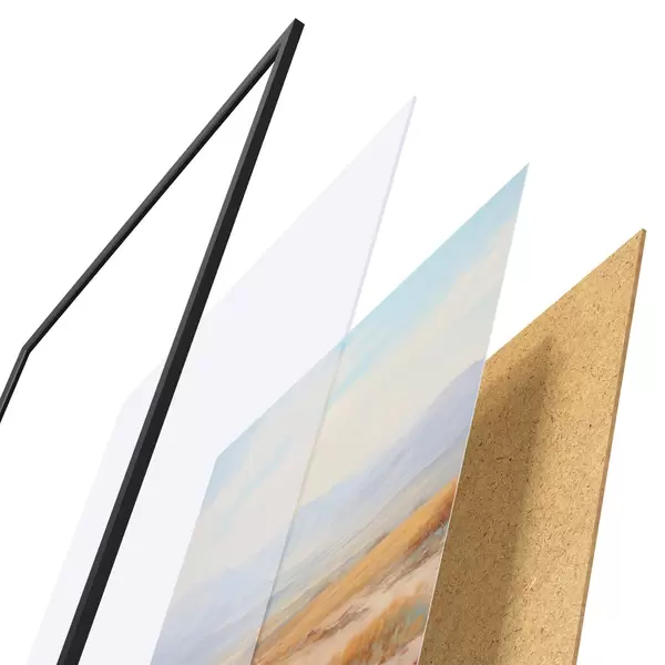 Plakat składa się z ramy, pleksi, wydrukowanego obrazu i podkładu z płyty wiórowej. Plakat można natychmiast zawiesić na ścianie dzięki uchwytom z tyłu.
