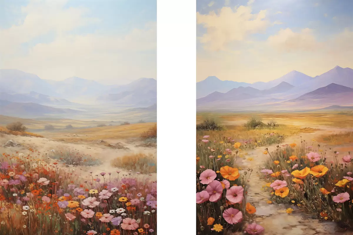Poster Krajobraz, pole kolorowych kwiatów z górami w tle, delikatne pastelowe kolory Nr d01003