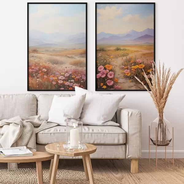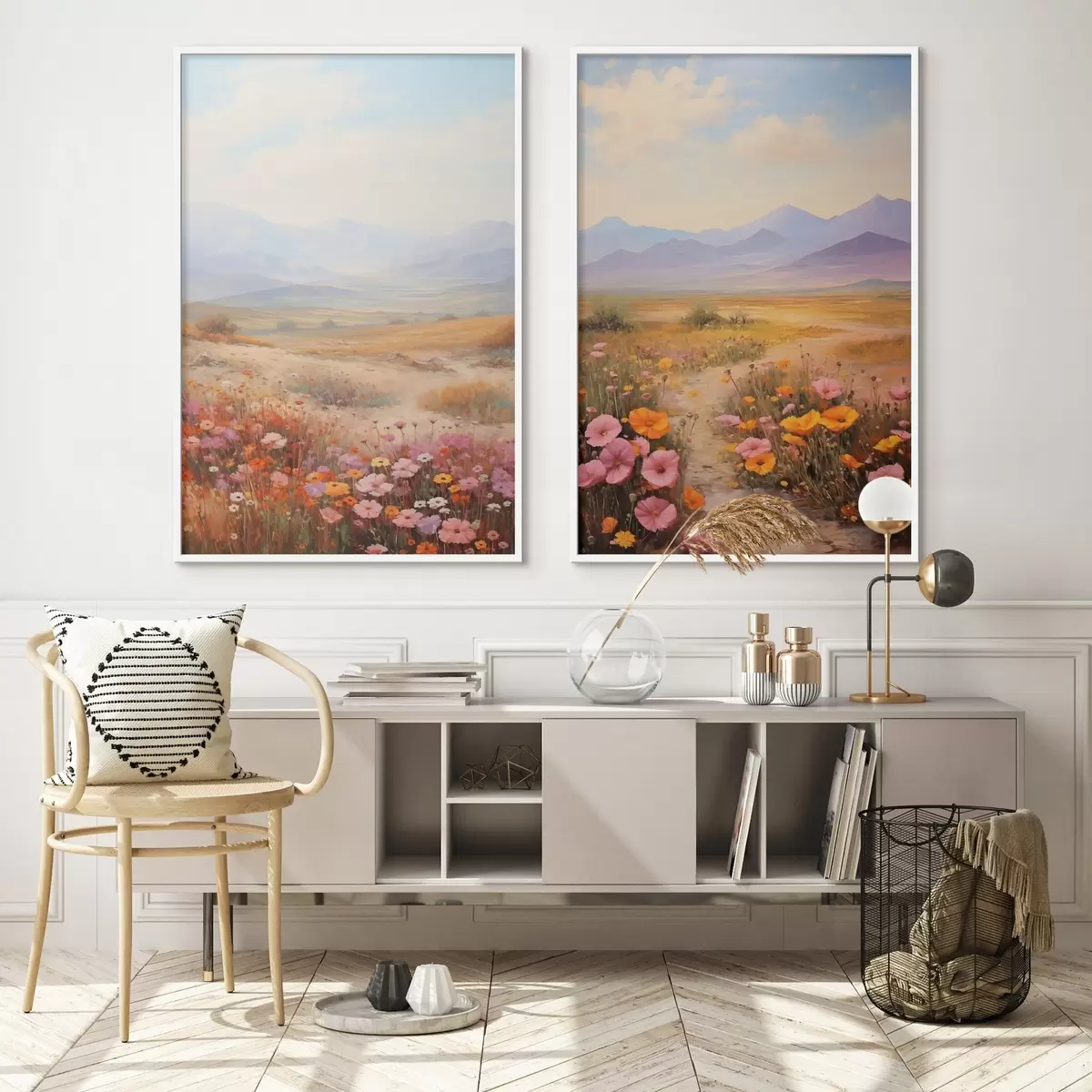 Plakat Krajobraz, pole kolorowych kwiatów z górami w tle, delikatne pastelowe kolory d01003