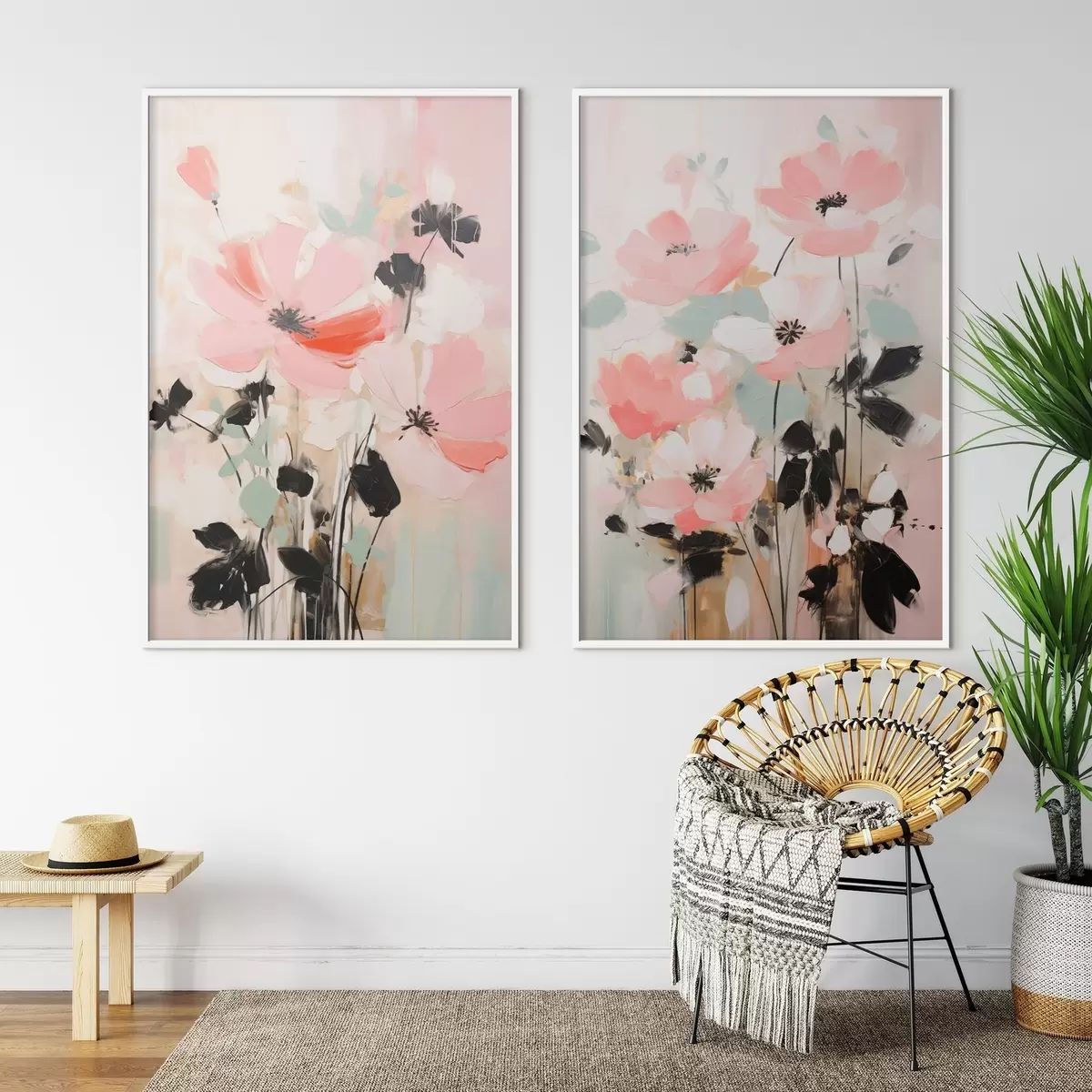 Poster Różowe i czarne kwiaty z liśćmi, delikatne pastelowe kolory, abstrakcyjna kompozycja kwiatowa, minimalistyczna sztuka Nr d01004