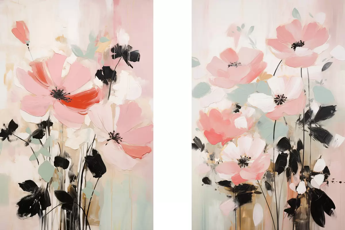 Poster Różowe i czarne kwiaty z liśćmi, delikatne pastelowe kolory, abstrakcyjna kompozycja kwiatowa, minimalistyczna sztuka Nr d01004