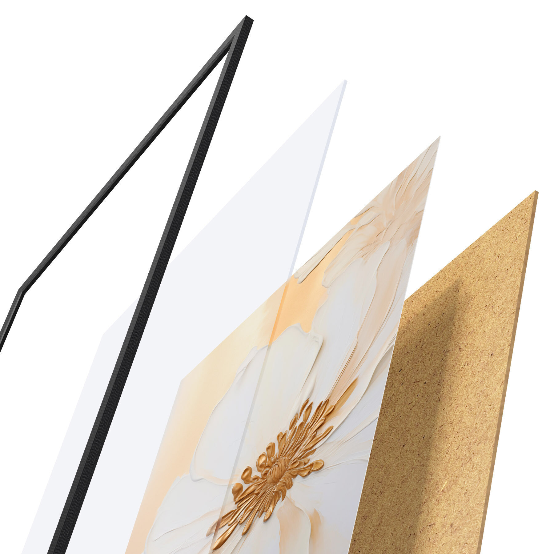 Plakat składa się z ramy, pleksi, wydrukowanego obrazu i podkładu z płyty wiórowej. Plakat można natychmiast zawiesić na ścianie dzięki uchwytom z tyłu.
