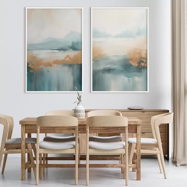Plakat Abstrakcyjny pejzaż z górami i jeziorem w kolorze turkusowym i teksturowanej żółci, delikatne pociągnięcia pędzla, minimalistyczna grafika d01012