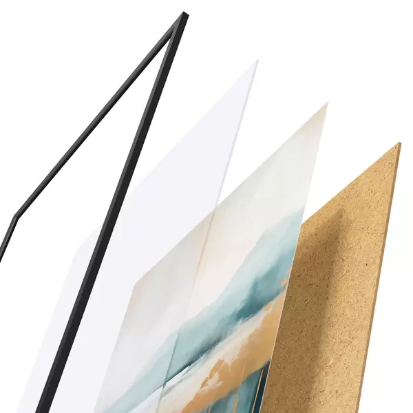 Plakat składa się z ramy, pleksi, wydrukowanego obrazu i podkładu z płyty wiórowej. Plakat można natychmiast zawiesić na ścianie dzięki uchwytom z tyłu.