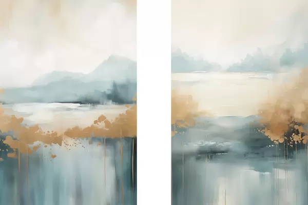 Plakat Abstrakcyjny pejzaż z górami i jeziorem w kolorze turkusowym i teksturowanej żółci, delikatne pociągnięcia pędzla, minimalistyczna grafika d01012