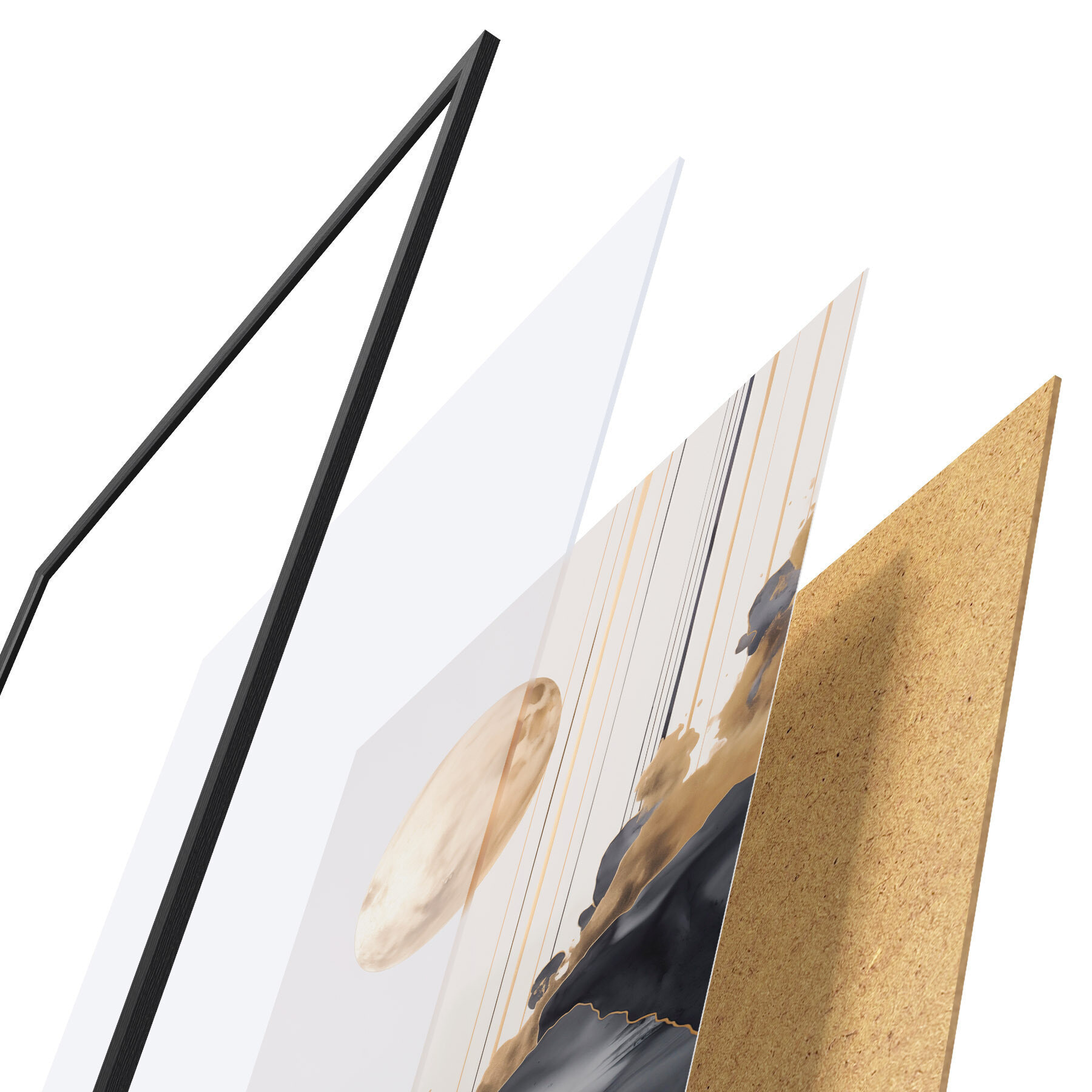 Plakat składa się z ramy, pleksi, wydrukowanego obrazu i podkładu z płyty wiórowej. Plakat można natychmiast zawiesić na ścianie dzięki uchwytom z tyłu.