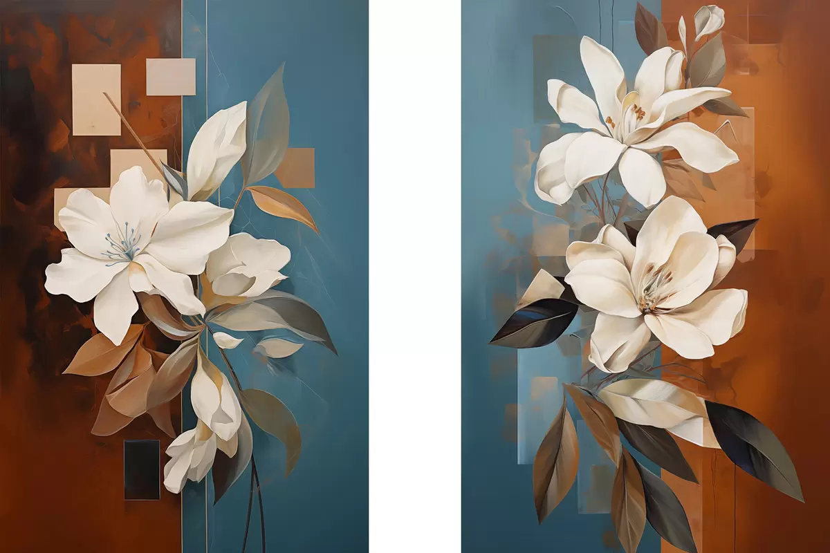 Poster Abstrakcyjne białe kwiaty i liście na tle brązowym i niebieskim z abstrakcyjnymi kształtami, w minimalistycznym stylu. Nr d01015
