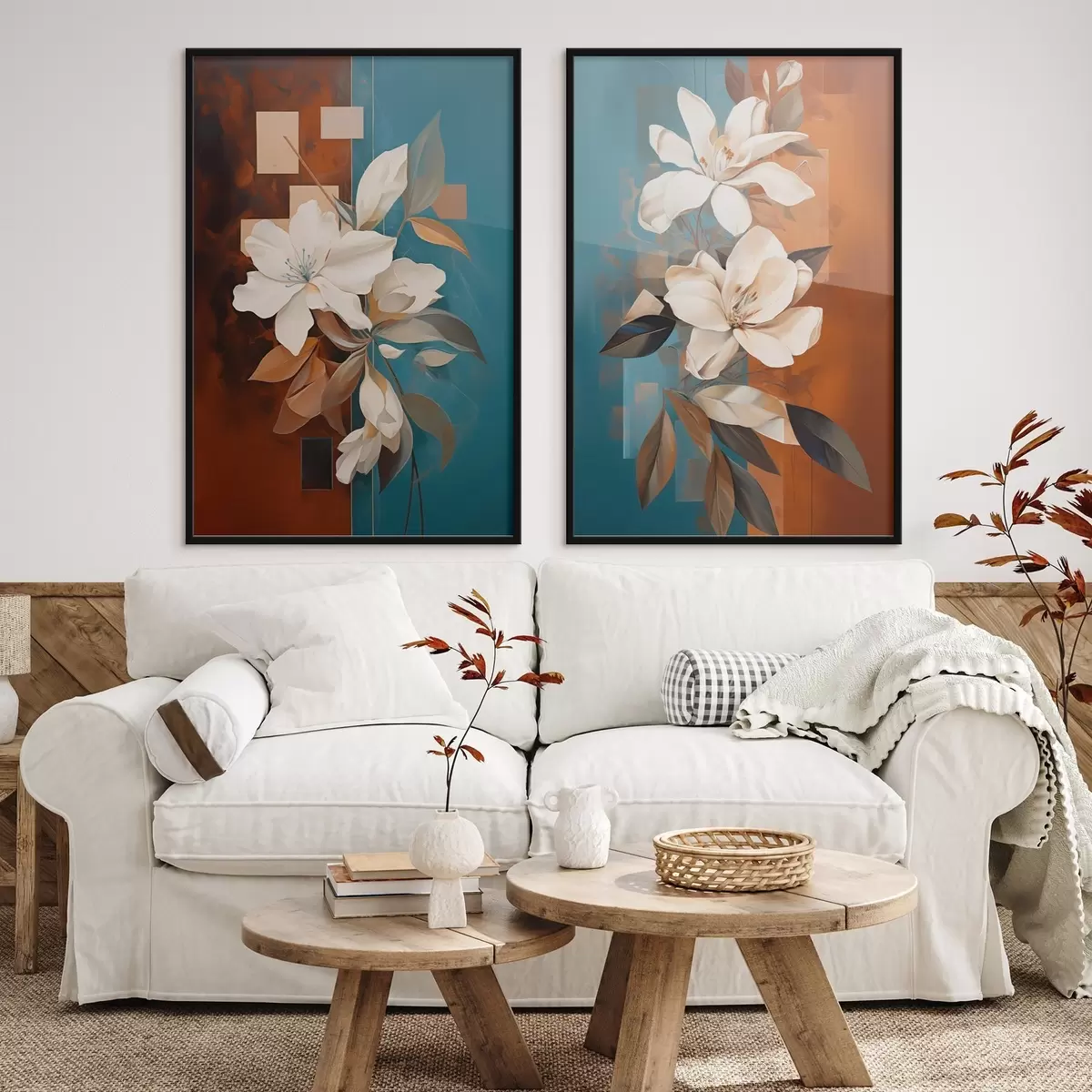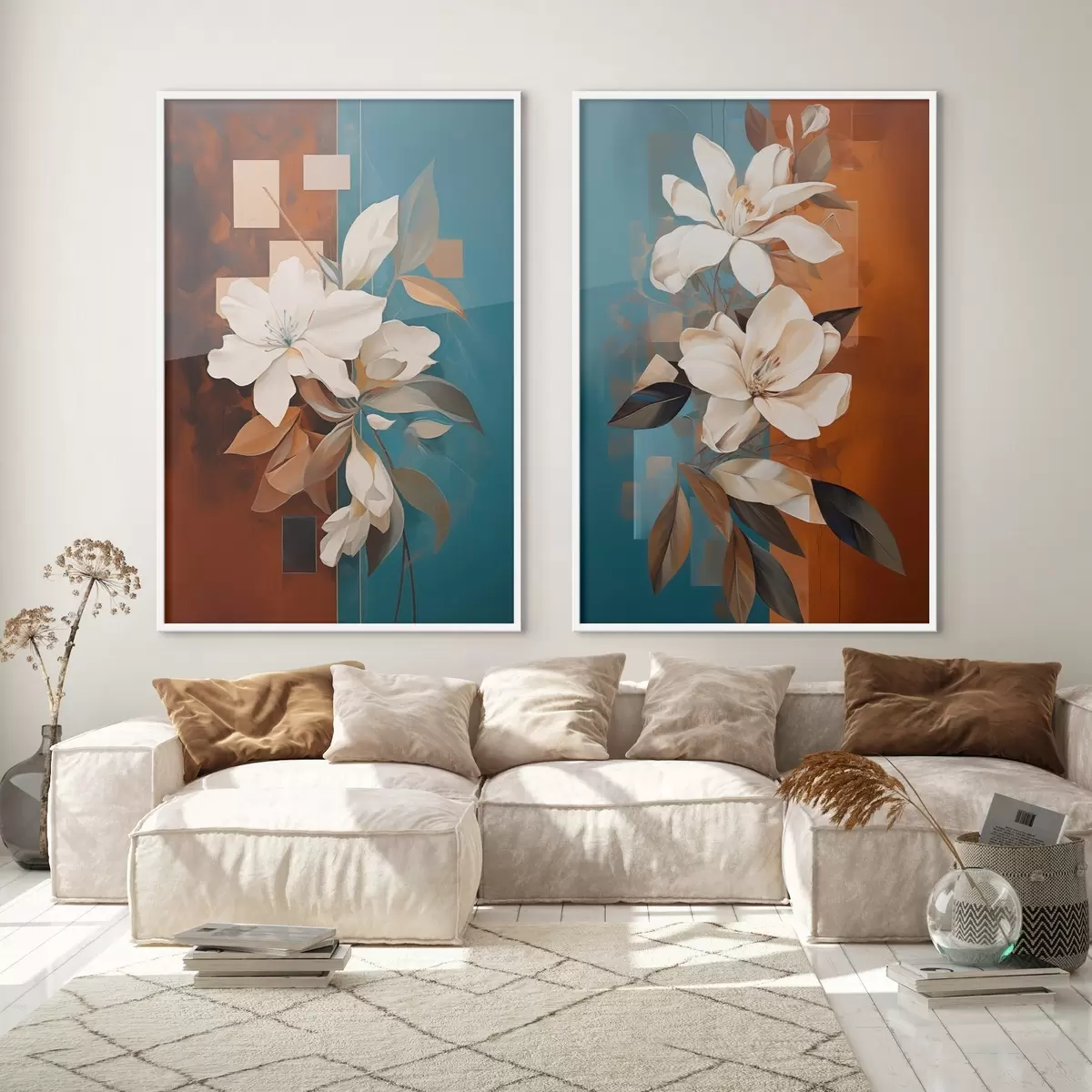 Plakat Abstrakcyjne białe kwiaty i liście na tle brązowym i niebieskim z abstrakcyjnymi kształtami, w minimalistycznym stylu. d01015