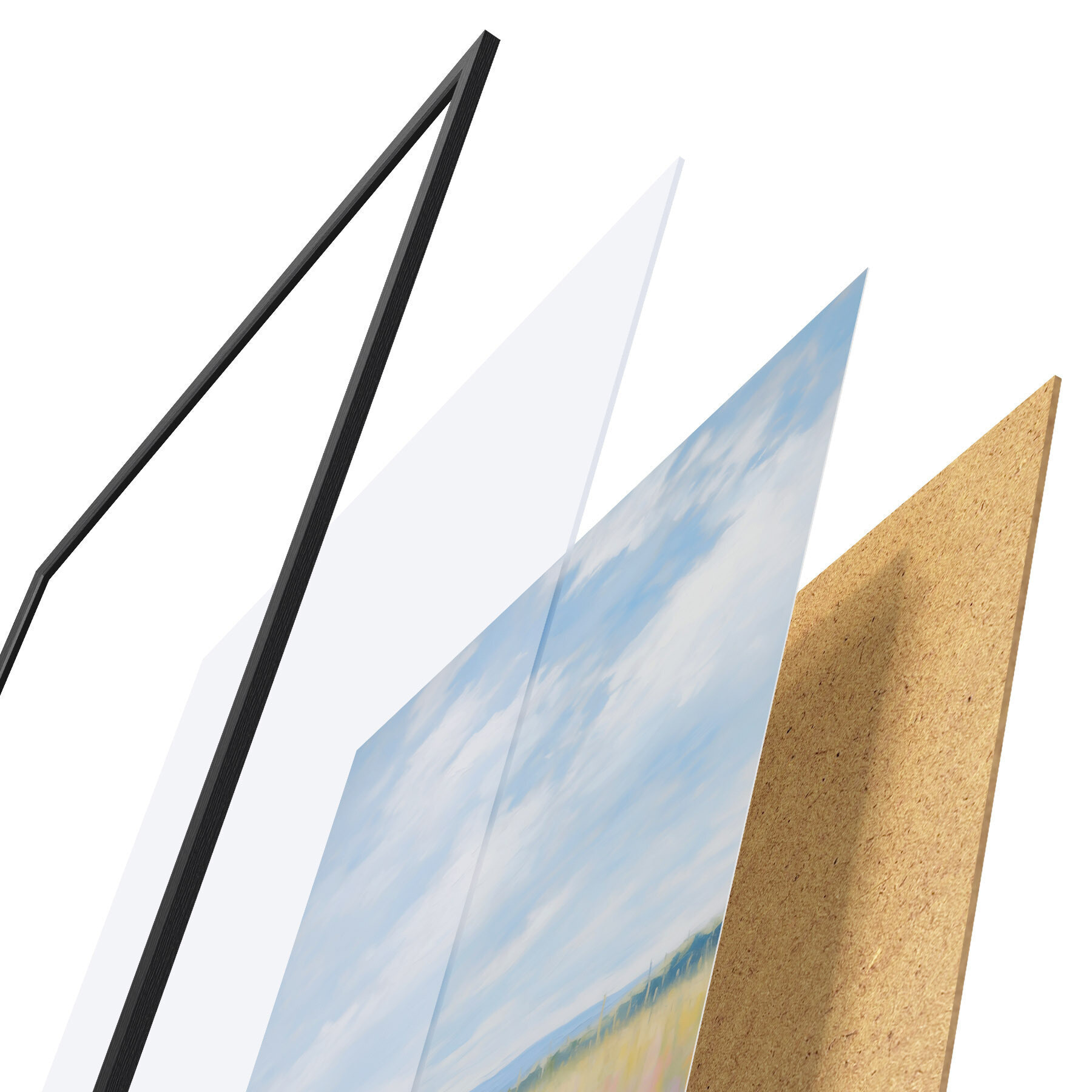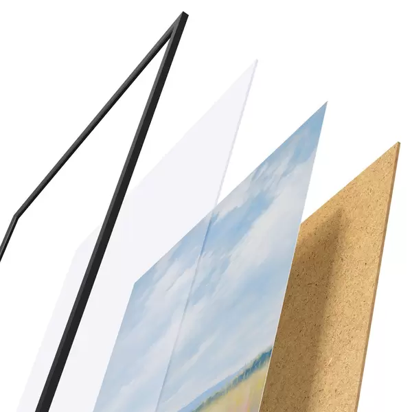 Plakat składa się z ramy, pleksi, wydrukowanego obrazu i podkładu z płyty wiórowej. Plakat można natychmiast zawiesić na ścianie dzięki uchwytom z tyłu.