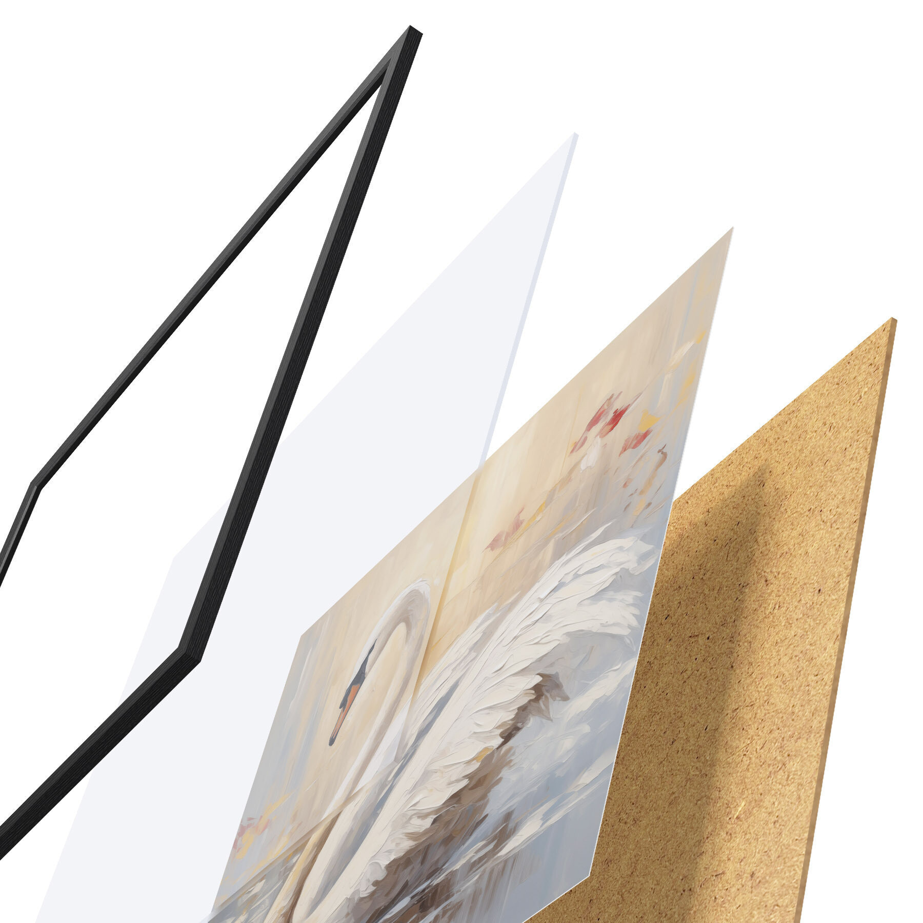 Plakat składa się z ramy, pleksi, wydrukowanego obrazu i podkładu z płyty wiórowej. Plakat można natychmiast zawiesić na ścianie dzięki uchwytom z tyłu.