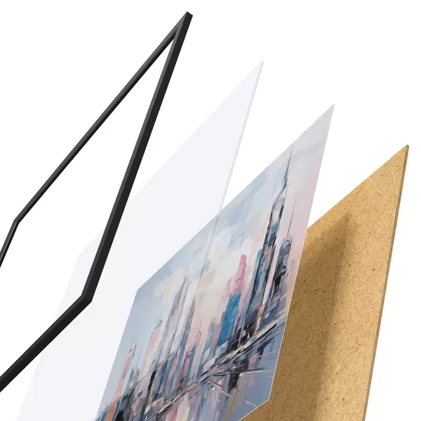 Plakat składa się z ramy, pleksi, wydrukowanego obrazu i podkładu z płyty wiórowej. Plakat można natychmiast zawiesić na ścianie dzięki uchwytom z tyłu.