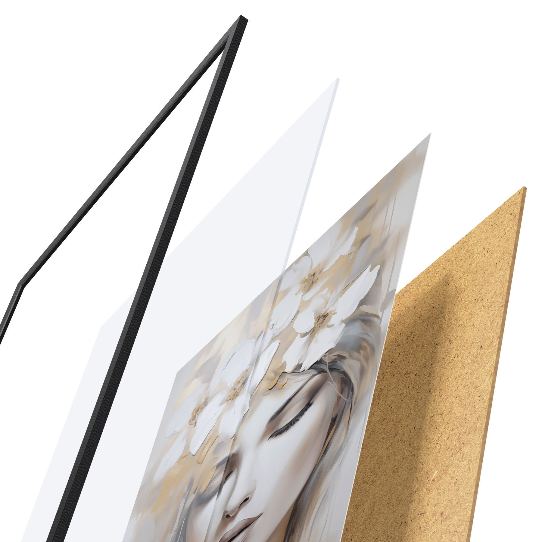 Plakat składa się z ramy, pleksi, wydrukowanego obrazu i podkładu z płyty wiórowej. Plakat można natychmiast zawiesić na ścianie dzięki uchwytom z tyłu.