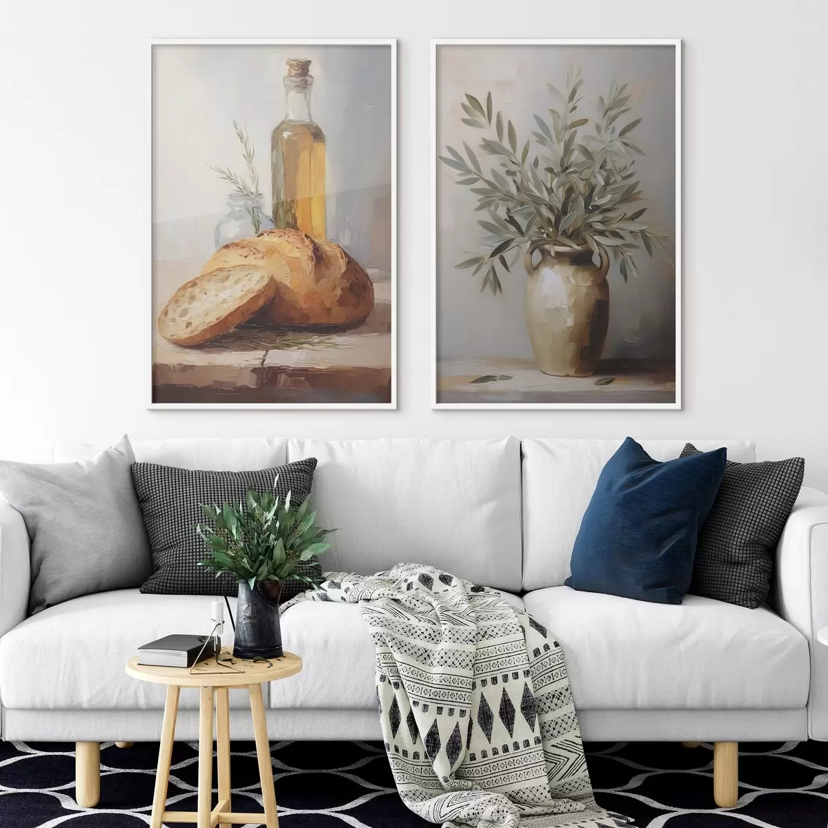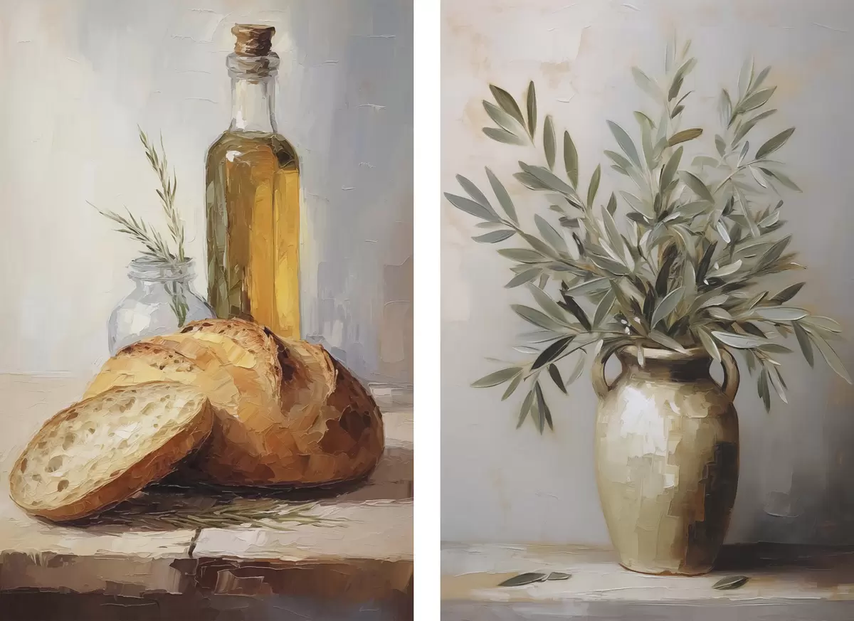 Poster Gałązki oliwne w wazonie, chleb i butelka oliwy, imitacja obrazu Nr d01035