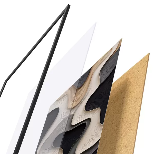 Plakat składa się z ramy, pleksi, wydrukowanego obrazu i podkładu z płyty wiórowej. Plakat można natychmiast zawiesić na ścianie dzięki uchwytom z tyłu.