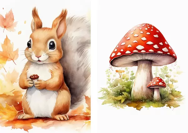 Poster Wiewiórka i grzyb leśny, muchomor, imitacja akwareli Nr d01049