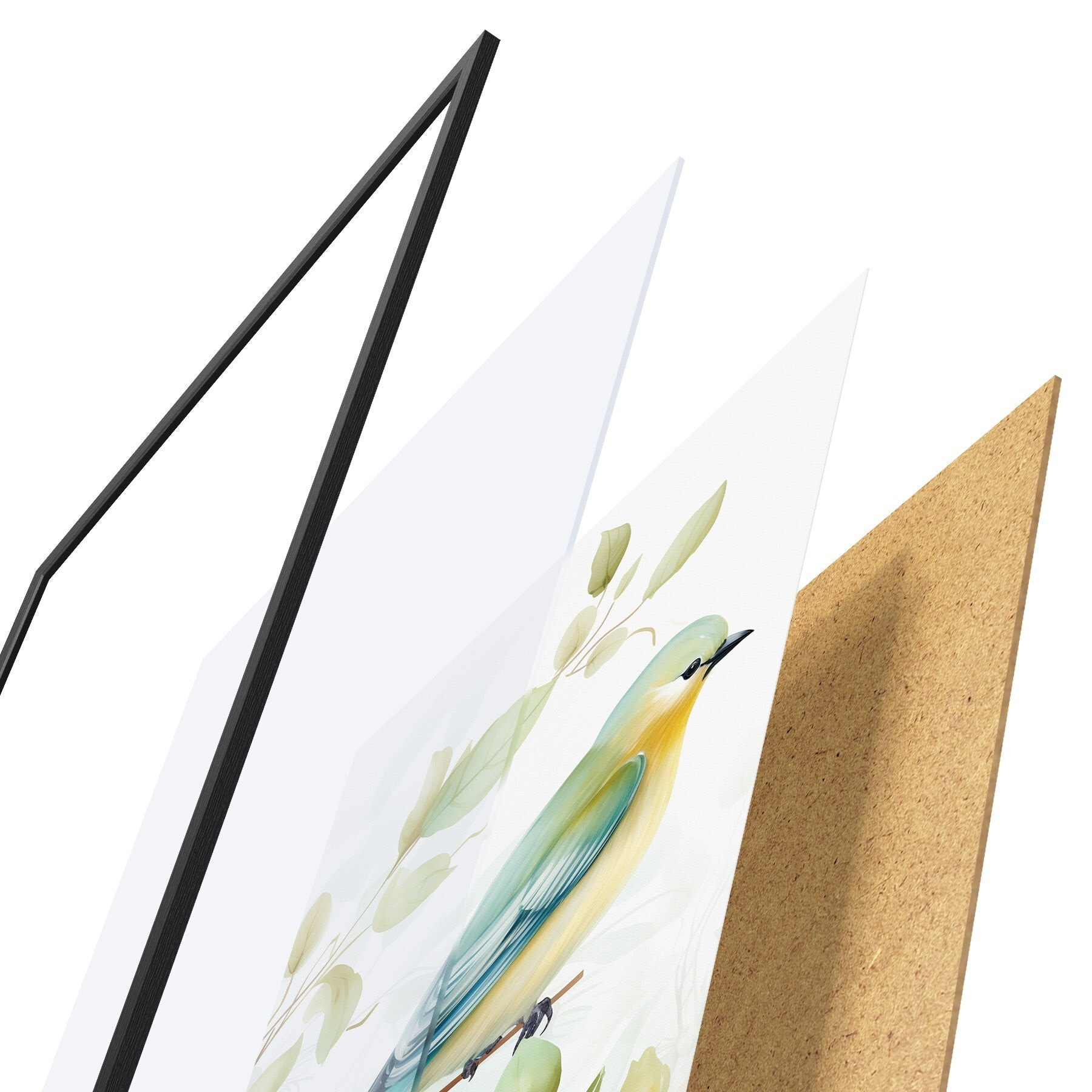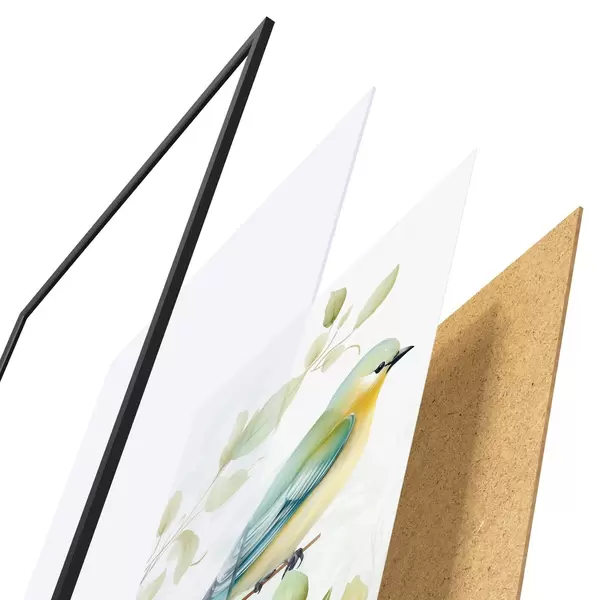 Plakat składa się z ramy, pleksi, wydrukowanego obrazu i podkładu z płyty wiórowej. Plakat można natychmiast zawiesić na ścianie dzięki uchwytom z tyłu.
